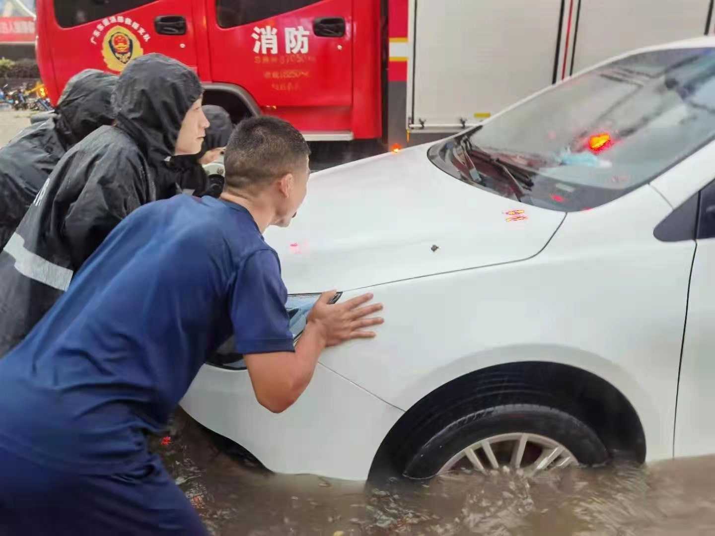在石碣鎮(zhèn)達(dá)鑫江濱新城高架橋路段有人員被困車(chē)內(nèi),接到報(bào)警后,石碣消防救援大隊(duì)火速趕往現(xiàn)場(chǎng)進(jìn)行救援。由于事故現(xiàn)場(chǎng)路段內(nèi)澇,水位不斷上升,道路出現(xiàn)嚴(yán)重?fù)矶?,消防?chē)無(wú)法通過(guò),在到達(dá)事故地點(diǎn)附近,消防救援人員決定下車(chē)步行至現(xiàn)場(chǎng)。在前往現(xiàn)場(chǎng)途中,消防救援人員發(fā)現(xiàn)一輛轎車(chē)內(nèi)有3名被困人員,立即把這3名被困群眾轉(zhuǎn)移到安全地帶,然后繼續(xù)前往事故地。到達(dá)事故現(xiàn)場(chǎng),消防救援人員立即把車(chē)內(nèi)1名被困群眾背到安全地帶。隨后,消防救援人員原路返回途中又發(fā)現(xiàn)1名電動(dòng)單車(chē)駕駛員受困,立即將其轉(zhuǎn)移到安全位置。