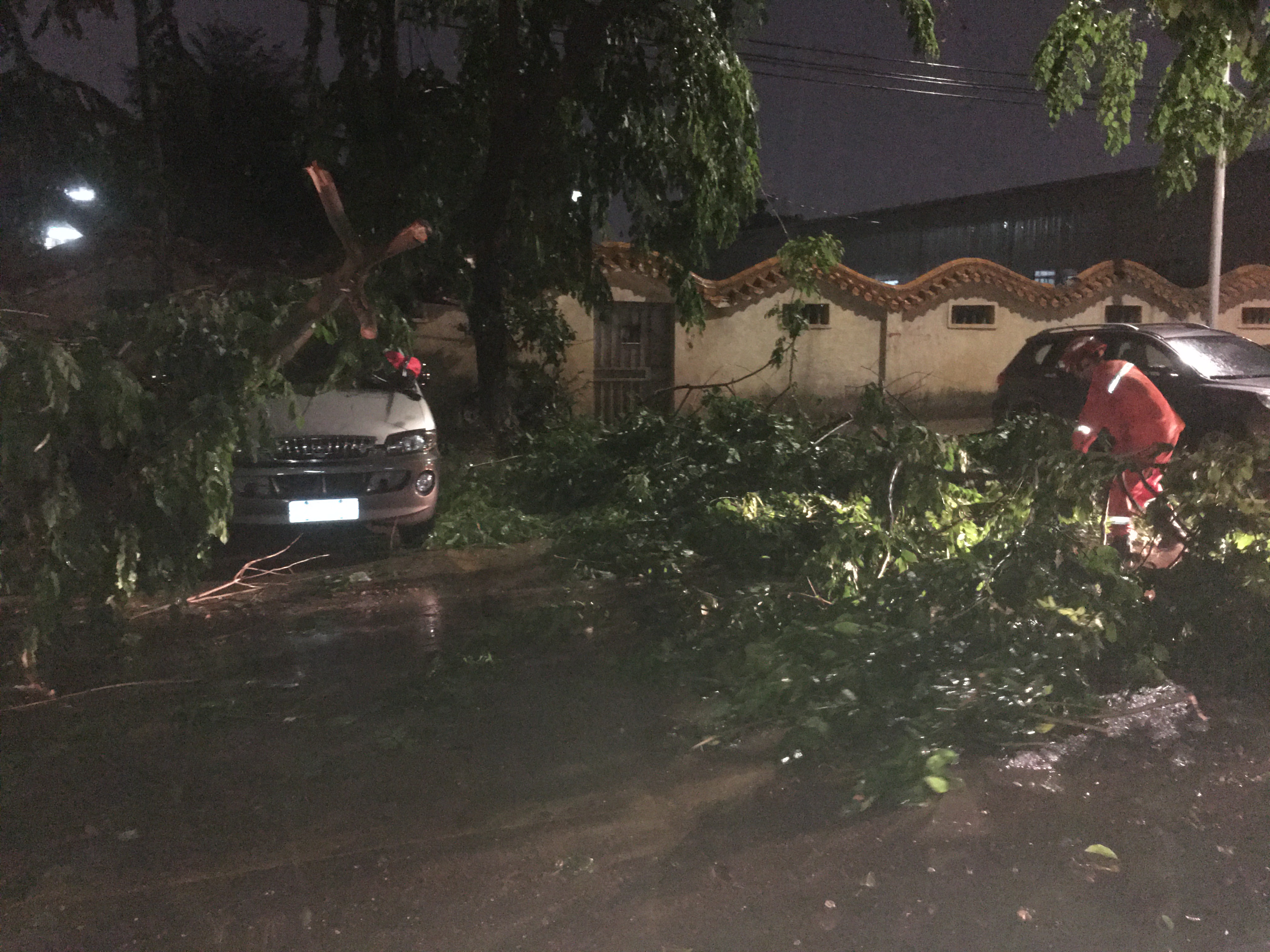 在厚街鎮(zhèn)汀山社區(qū),路邊一大樹(shù)突然倒下,一輛私家車(chē)被倒下來(lái)的樹(shù)干砸中車(chē)頭,幸好車(chē)內(nèi)無(wú)人,厚街鎮(zhèn)消防救援大隊(duì)接警到場(chǎng)后使用機(jī)動(dòng)鏈鋸、手動(dòng)拉鋸等工具,經(jīng)過(guò)約40分鐘左右的緊張救援,成功將倒下的樹(shù)干鋸開(kāi),將車(chē)輛轉(zhuǎn)移到安全區(qū)域。